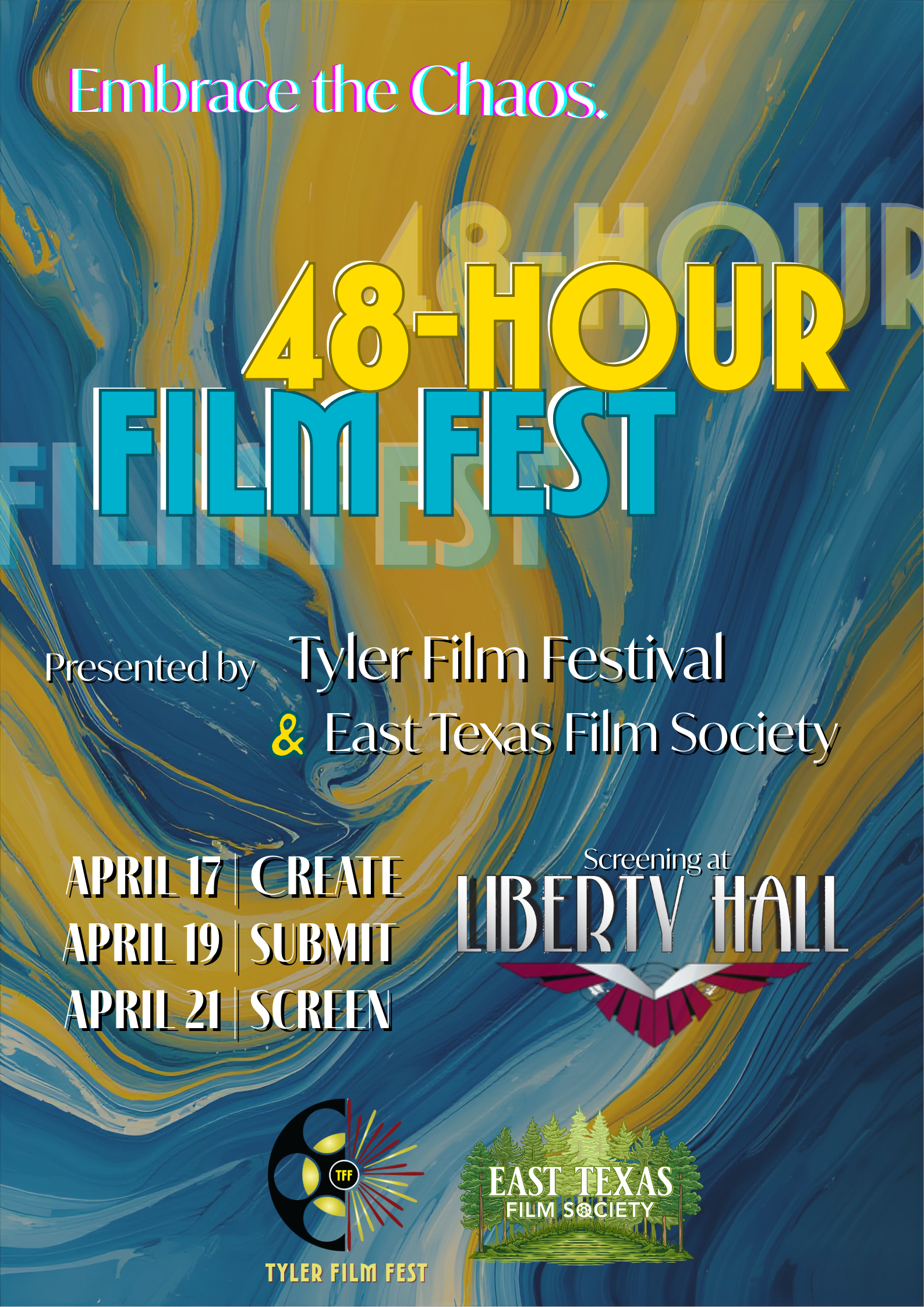 The Tyler Film Fest and East Texas Film Society are teaming up to present our first 48-hour Film Fest. We invite filmmakers to join us in embracing chaos from April 17-21. Filmmakers can compete in groups of up to 5 people but no less than 2 people, including actors. The entry fee is $25 per group